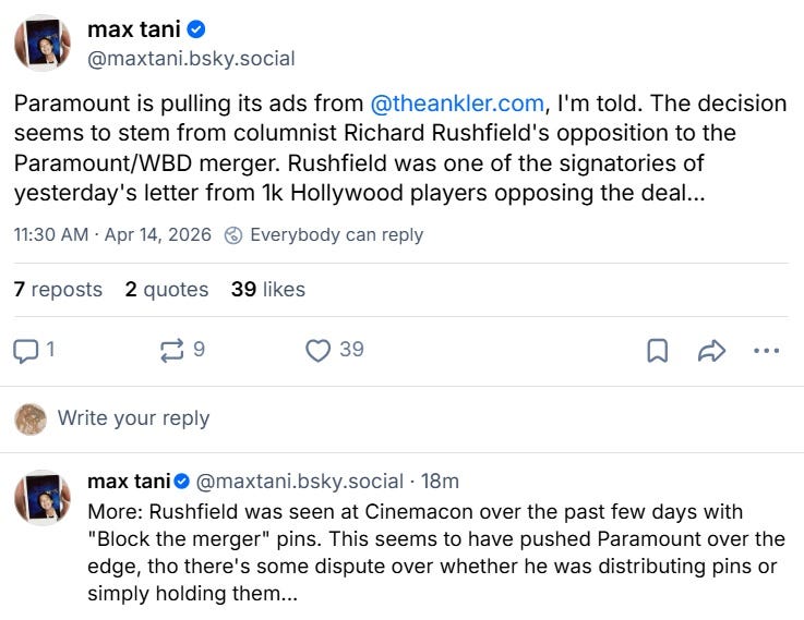 In yesterday’s newsletter, I wrote about the big online open letter signed by more than 1,000 Hollywood creatives. They came out forcefully against the proposed Paramount Skydance merger with Warner Bros. Discovery and I argued that the idea was weeks too late and felt primarily performative.